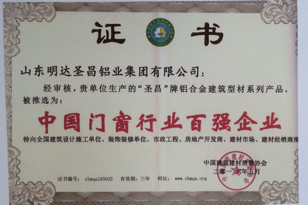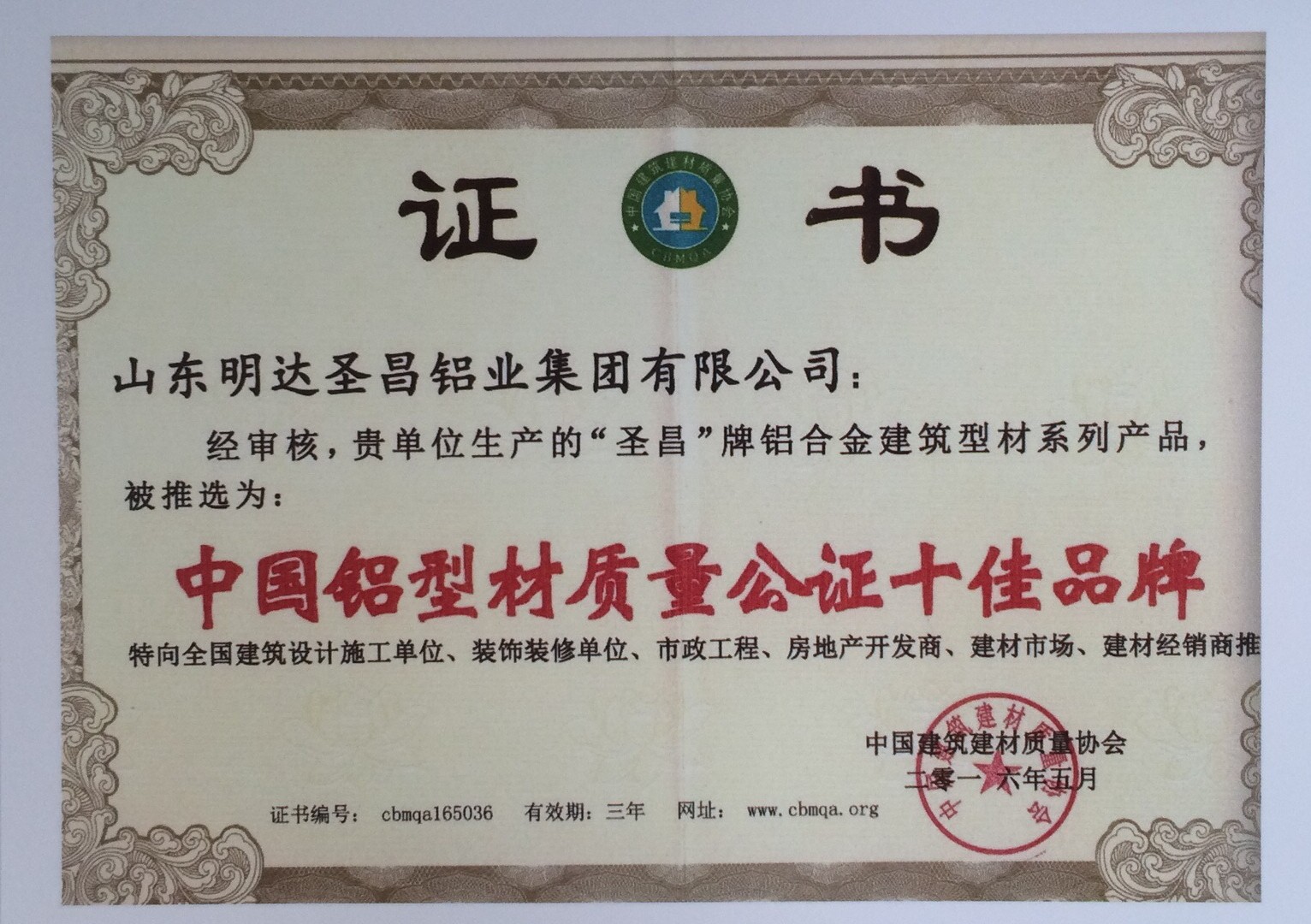 | 中国铝型材质量公证十佳品牌 | 中国建筑建材质量协会 | 至2019-05-31 | |